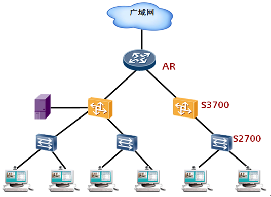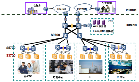 中小企業可(kě)以采用(yòng)S3700作爲核心交換機,利用(yòng)S3700的(de)路由功能實現跨網段的(de)部門和(hé)用(yòng)戶的(de)互訪。多(duō)台之間可(kě)以使用(yòng)堆疊技術實現設備性能和(hé)端口的(de)同步擴展。