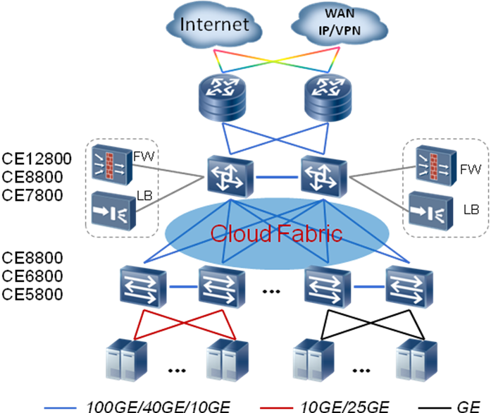 在數據中心的(de)典型組網中,采用(yòng)CE12800/CE8800/CE7800作爲網絡的(de)核心交換機,CE8800/CE6800/CE5800作爲TOR交換機,與CE12800/CE8800/CE7800通(tōng)過100GE/40GE/10GE端口互聯。采用(yòng)TRILL、VxLAN等fabric協議(yì)組建無阻塞大(dà)二層網絡,保證虛拟機的(de)大(dà)範圍遷移以及用(yòng)戶業務的(de)靈活部署。