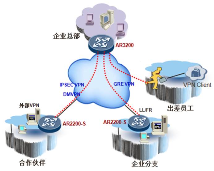 AR2200-S系列企業路由器提供了(le)多(duō)種安全接入功能,滿足企業分(fēn)支之間、企業分(fēn)支與總部之間、合作夥伴訪問企業内部信息的(de)需求。總部和(hé)分(fēn)支架構建立隧道,包括GRE VPN、IPSEC VPN、DSVPN、L2TP VPN安全隧道,實現數據的(de)安全訪問與傳輸,支持分(fēn)支機構側隧道的(de)快(kuài)速部署,隧道認證等功能。通(tōng)過遠(yuǎn)程隧道接入方式,合作夥伴可(kě)以訪問企業内部資源,支持針對(duì)用(yòng)戶的(de)安全認證與授權。