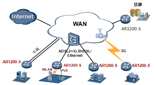 AR1200-S系列企業路由器作爲分(fēn)支用(yòng)戶的(de)出口路由器,支持廣域網的(de)各種靈活接入方式,進行遠(yuǎn)程網絡互聯。單一設備就能滿足專線、以太、xDSL、3G、WLAN等多(duō)種接入需求,節約部署運維成本,靈活地爲客戶提供最大(dà)價值。