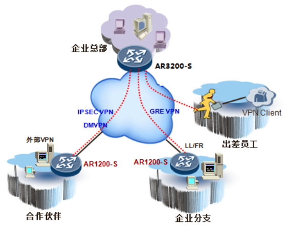 AR1200-S系列企業路由器提供了(le)多(duō)種安全接入功能,滿足企業分(fēn)支之間、企業分(fēn)支與總部之間、以及合作夥伴訪問企業内部信息的(de)需求。總部和(hé)分(fēn)支機構建立隧道,包括GRE VPN、IPSEC VPN、DSVPN、L2TP VPN安全隧道,實現數據的(de)安全訪問與傳輸,支持分(fēn)支機構側隧道的(de)快(kuài)速部署和(hé)認證等功能。通(tōng)過遠(yuǎn)程隧道接入方式,合作夥伴可(kě)靈活訪問企業内部資源,實現企業内資源的(de)安全和(hé)共享。