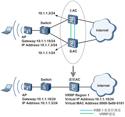 2、HSB+VRRP(Virtual Router Redundancy Protocol),主備AC對(duì)AP始終顯示一個(gè)虛IP地址,主AC需要備份AP表項、CAPWAP鏈路信息、以及用(yòng)戶信息到備AC上。該方案AP隻看到一個(gè)AC的(de)存在,AC間的(de)切換由VRRP決定。當前不支持VRRP多(duō)實例場(chǎng)景。